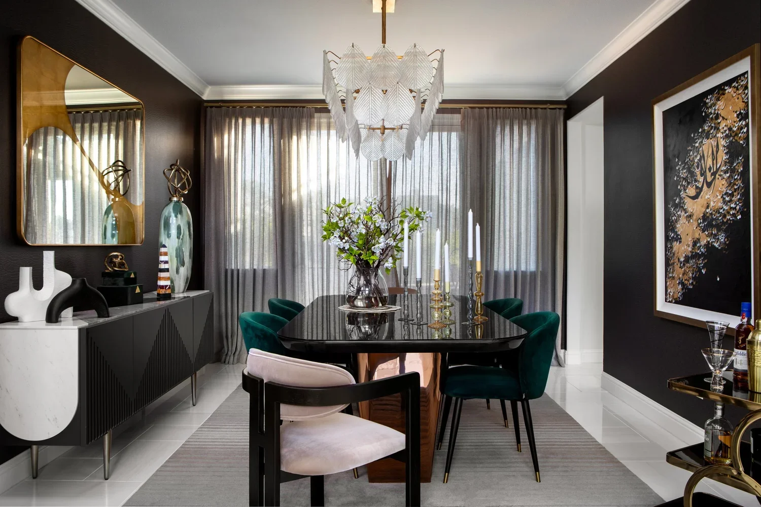 This whole-house remodel and furnishing project was designed for a client with a distinctly modern aesthetic. Anchored in a sophisticated black-and-white palette, the design is elevated through the thoughtful use of brass finishes and a carefully curated selection of warm tones introduced through art, accessories, and layered textures. The result is a home that feels both striking and inviting—where clean, contemporary lines are balanced with warmth and livability.