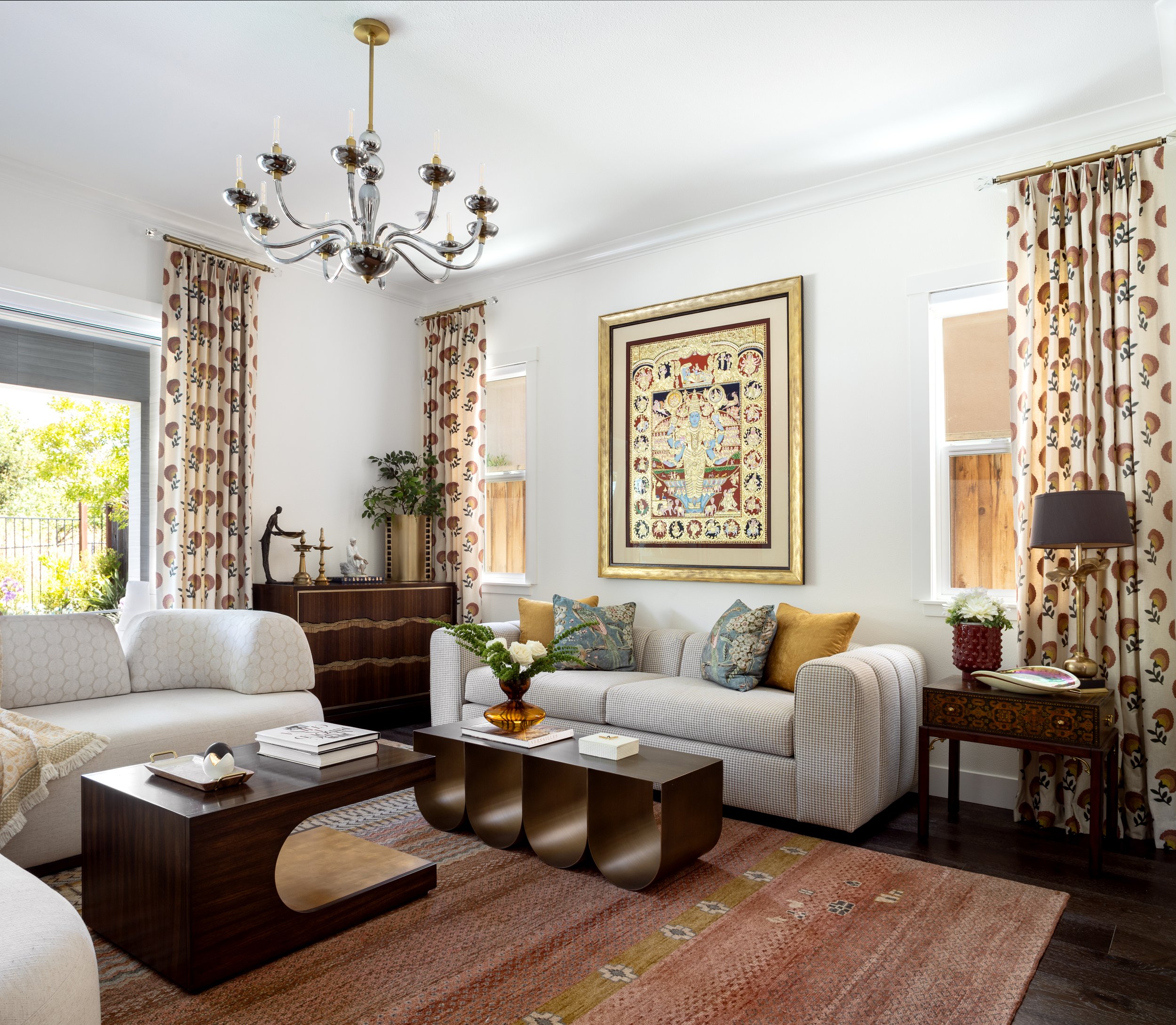 Inspired by Indian heritage and traditions, this project was thoughtfully designed around the clients’ cherished art collection, which became the foundation for the overall design narrative. The open-concept family room, entry, and home office were designed and furnished to create a cohesive and inviting flow, complemented by fully designed guest bedrooms and a serene primary suite.